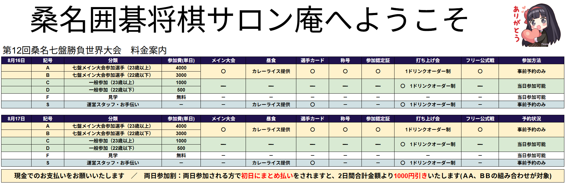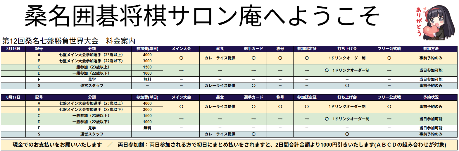 備考 昼食は12時30分~13時20分頃までに桑名囲碁将棋サロン庵にてご提供します
