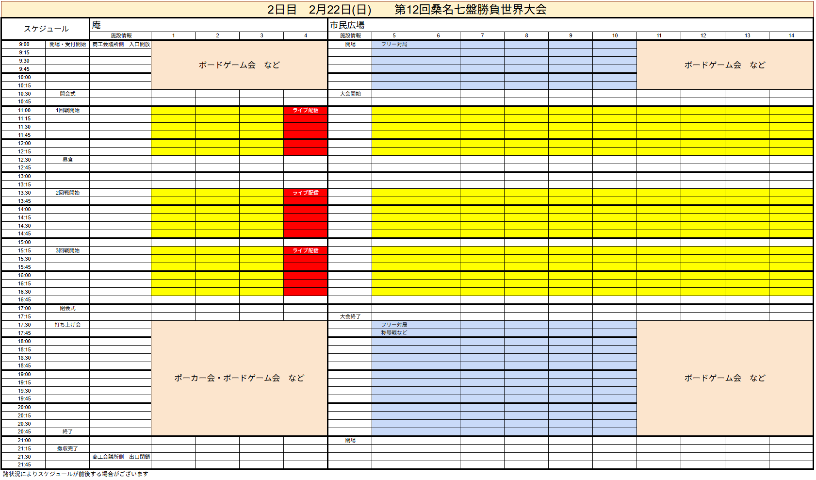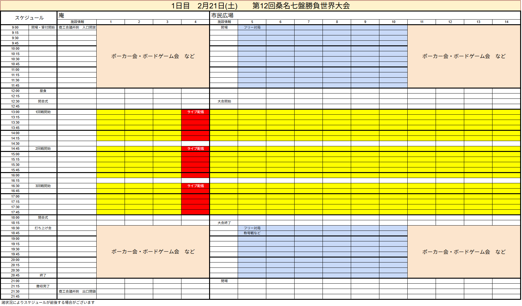 時間 12時30分大会開始~18時30分頃大会終了/9時開場:21時頃閉場