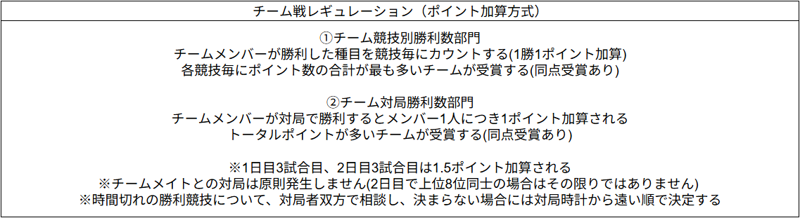 ※チーム戦におけるチームメイトとの対局は原則発生しません(2日目で上位8位同士の場合はその限りではありません)