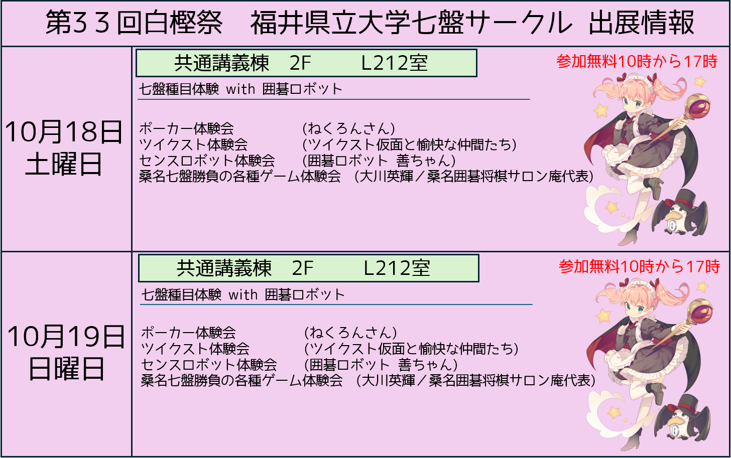 【共通講義棟2F L212室】 内容 連珠・どうぶつしょうぎ・オセロ・チェス・9路盤囲碁・将棋・バックギャモンなどの体験会 会場 福井県立大学 永平寺キャンパス/福井県永平寺町松岡兼定島4-1-1 時間 10時00分開場/17時00分イベント終了予定(※) 参加費 無料・予約不要 来場特典 桑名七盤勝負かんたんルールブックをプレゼントします(数に限りはございます)