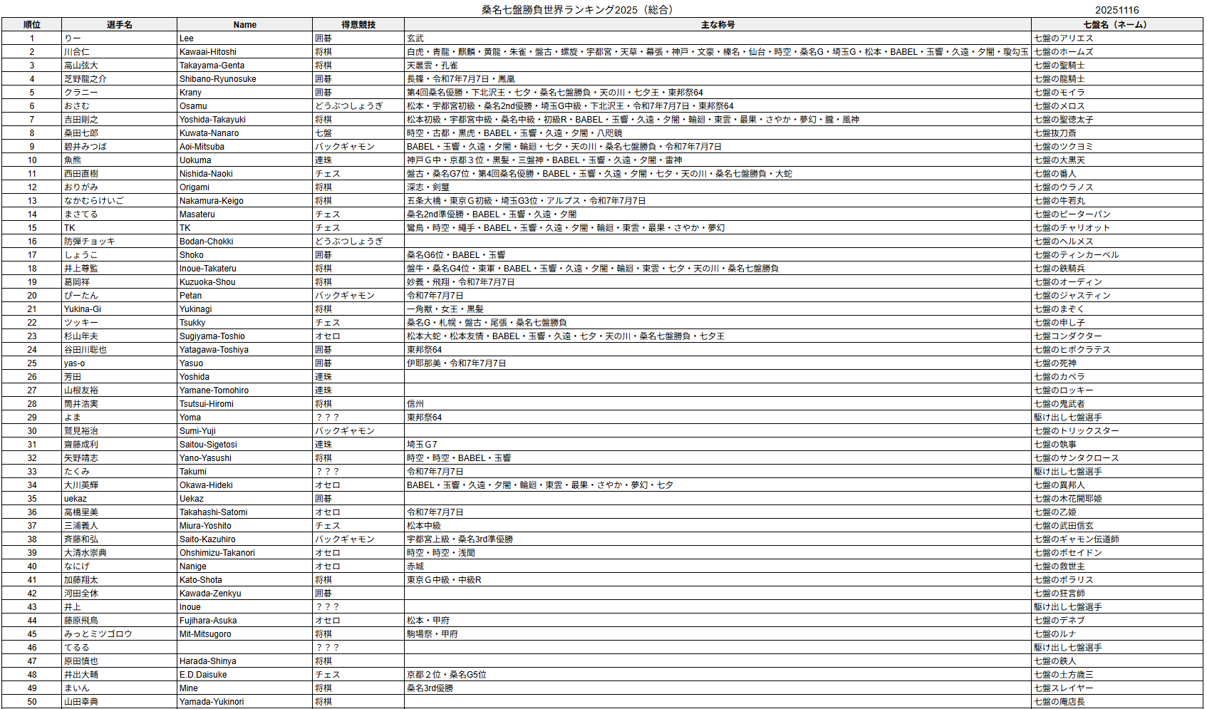 桑名七盤勝負世界ランキング2025を更新いたしました。
