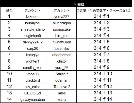 対戦カード及び合言葉は運営配信にて発表いたします。少し遅れて本ページにも掲載いたします。