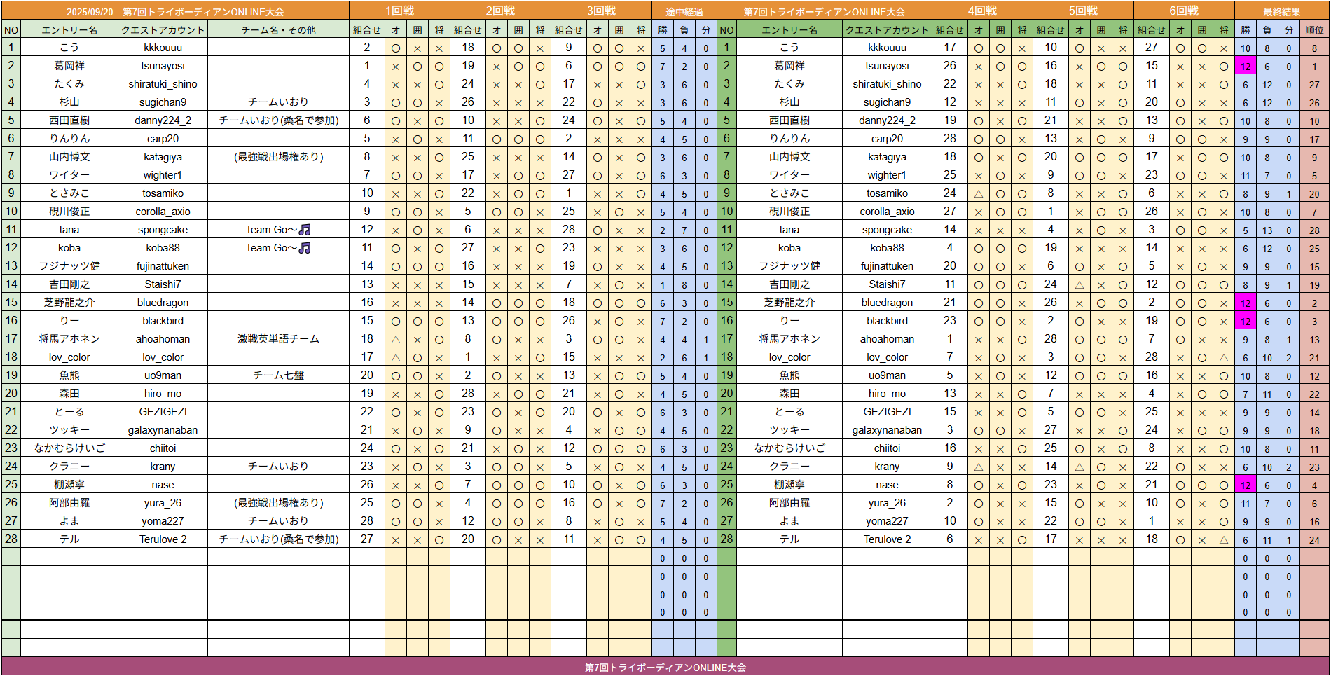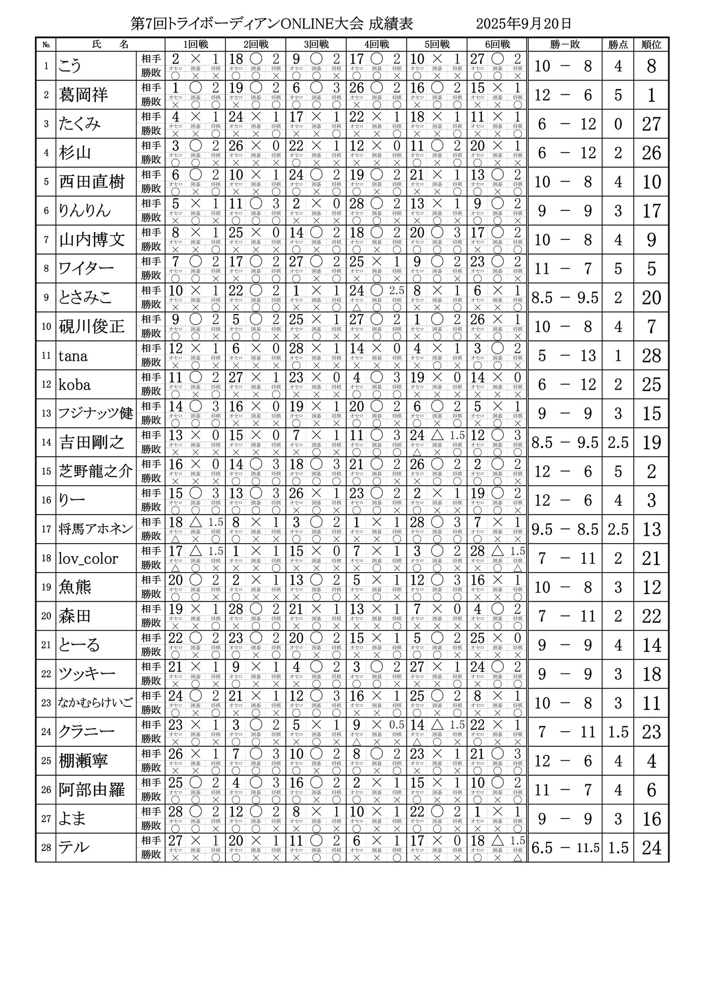 3種目の対局が完了しましたら、運営配信にお戻りいただくとともに両選手とも対局結果を対局結果報告用掲示板に書き込んでくださいませ。