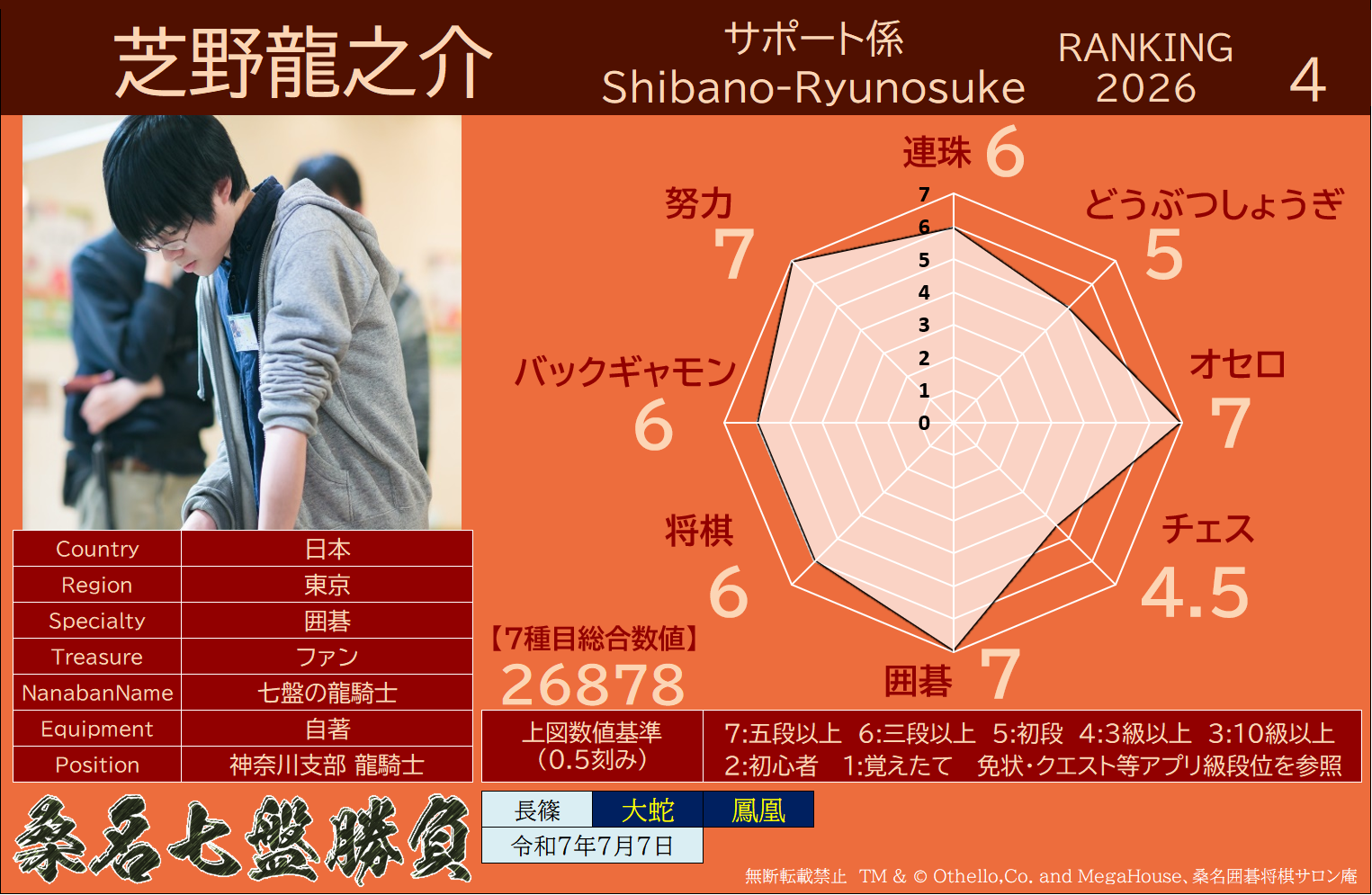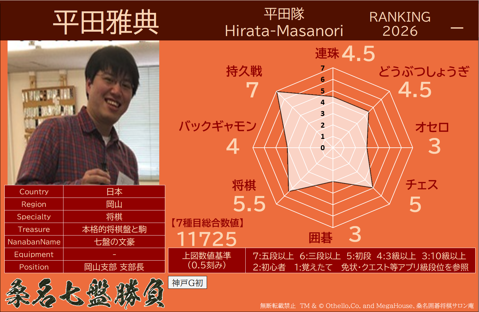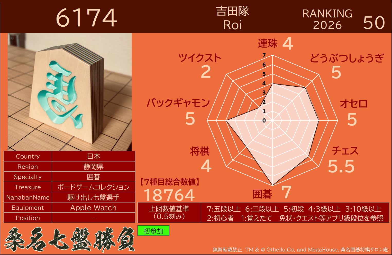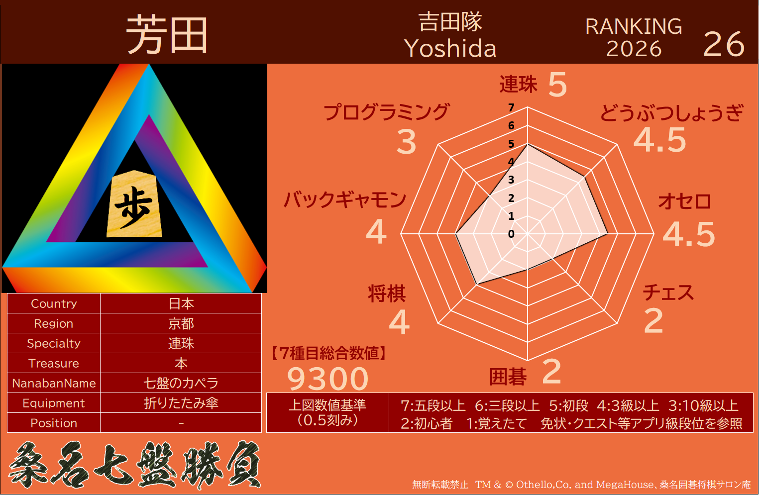 ・連珠・どうぶつしょうぎ・オセロ・チェス・9路盤囲碁・将棋・バックギャモンなどの七種目同時対局(持ち時間45分/切れ負け)
